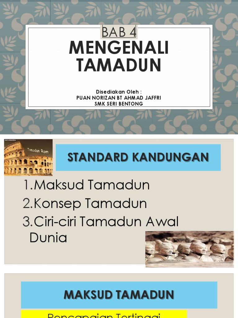 TINGKATAN 1 SEJARAH TINGKATAN 1 MENGENALI TAMADUN 41 Maksud Tamadun 42 Konsep Tamadun 43 Ciri-ciri Tamadun Bahasa Yunani Islam Awal Dunia. Kepercayaan kepada unsur ghaib ini dikenali sebagai. Makna Ciri-ciri Tamadun.